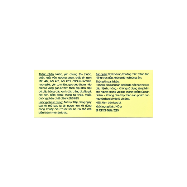 Thành phần: Nước, yến chưng 9%, gạo dẻo thơm, nếp cái hoa vàng, gạo lứt tím than, đậu các loại, hạt sen, nấm đông trùng hạ thảo, muối, đường phèn, bột ngọt, hương đậu tự nhiên